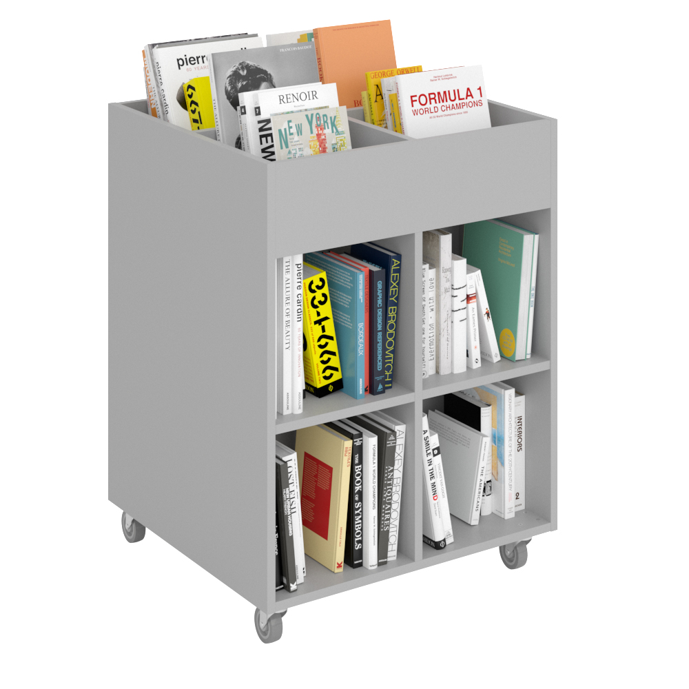 Sara Maxi er en billedbogskrybbe med fire eksponeringsrum øverst og otte opbevaringsrum nederst. Ideel til både børn og voksne.