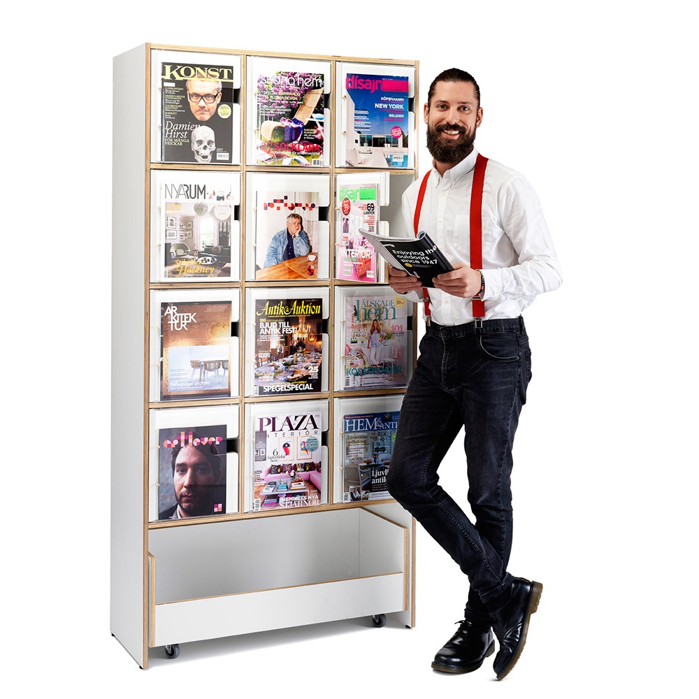 Slank ergonomisk udformet møbel til tidsskrifter, magasiner eller andre seriepublikationer. Frontlågerne med klar akryl til display har generøs displaydybde.