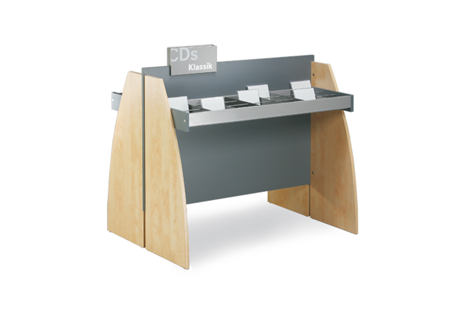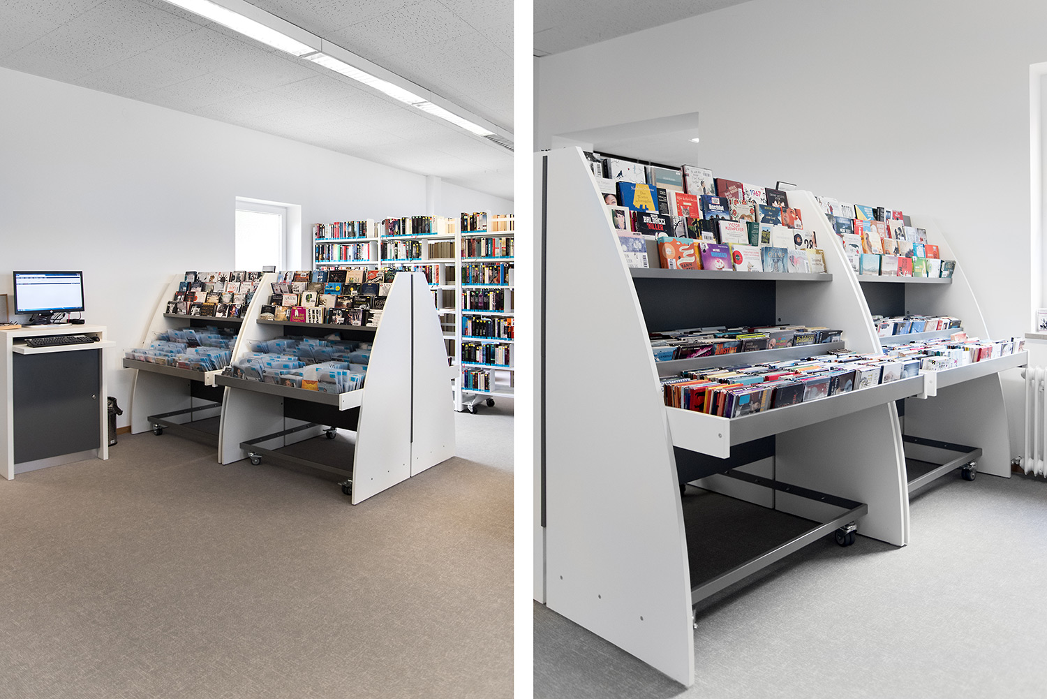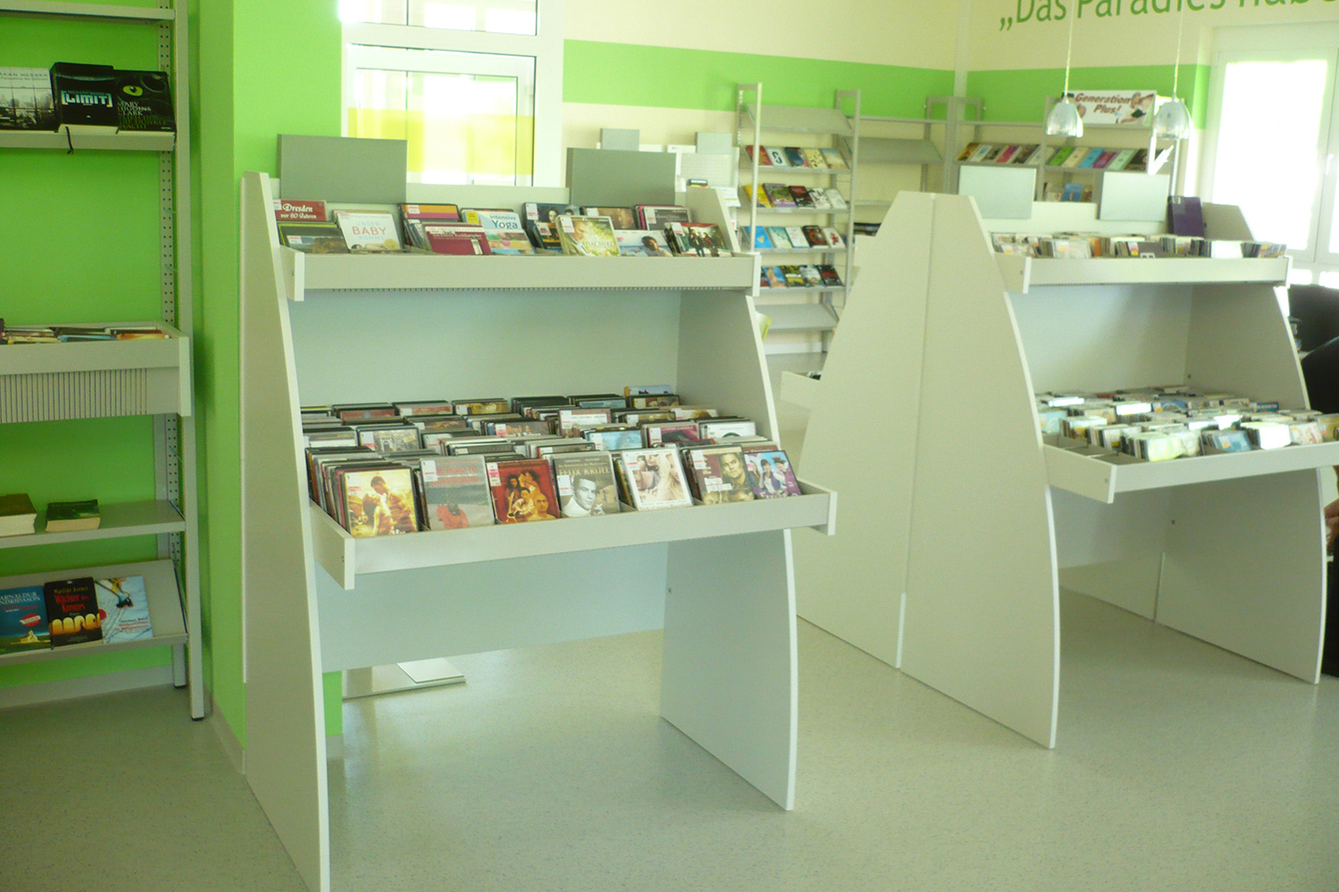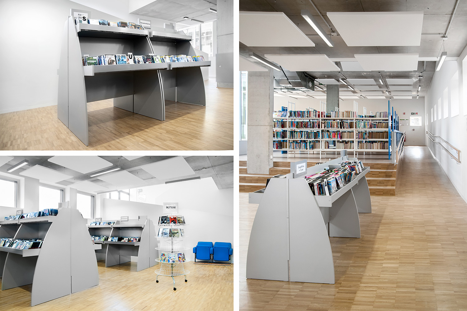 Sinus krybbens afrundede design gør den til et meget præsentabelt møbel i biblioteket. Der er fire forskellige modeller i serien: Den fås som enkeltsidet eller dobbeltsidet model samt med enten en eller to præsentationshylder.