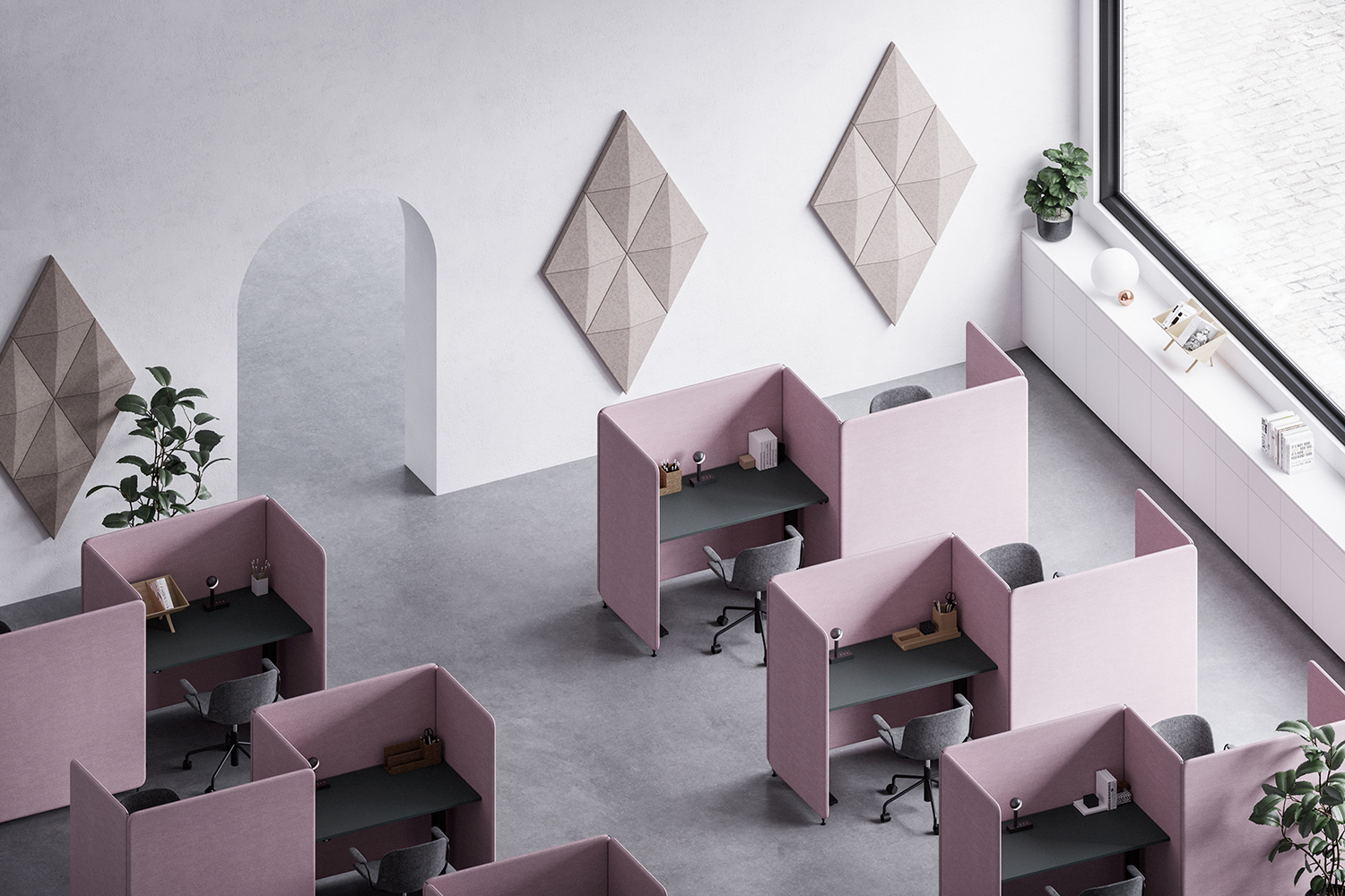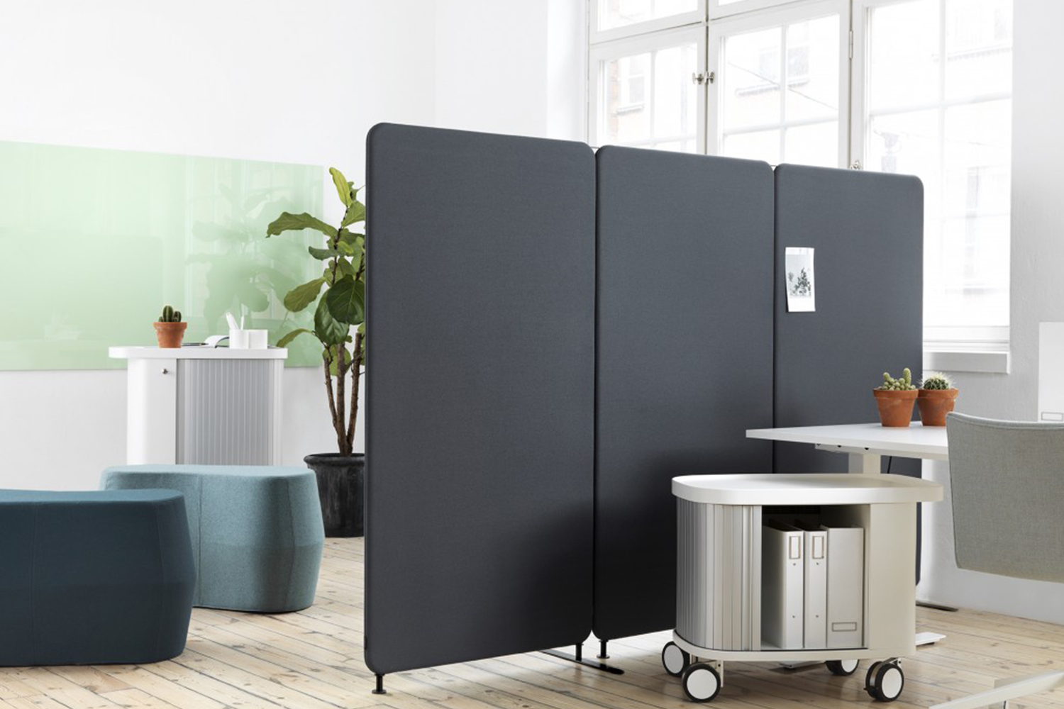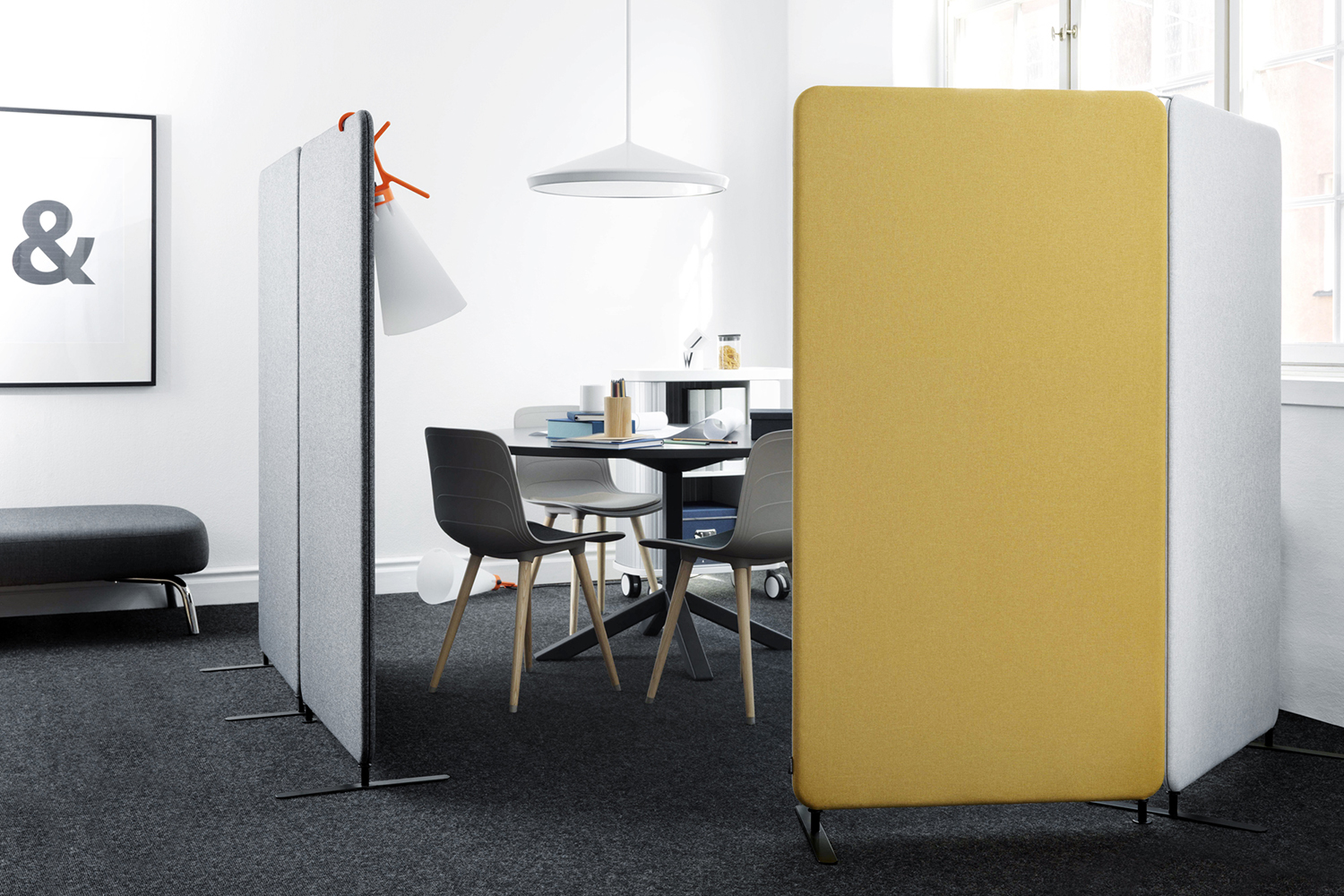 Rumdeler og støjdæmper i ét. I miljøer med højt støjniveau giver den størst mulig dæmpning (lydklasse A).