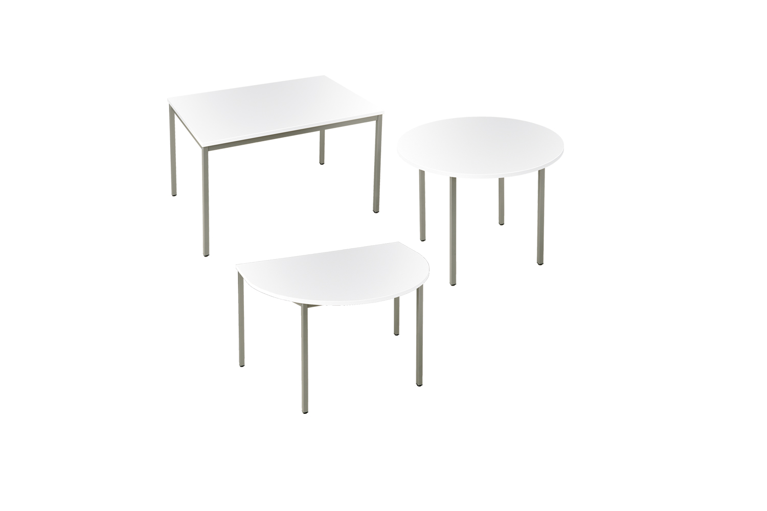 Bordene fås i tre versioner: rektangulær, rund og halvrund. Stålbenene fås i 30 x 30 mm firkantede ben.