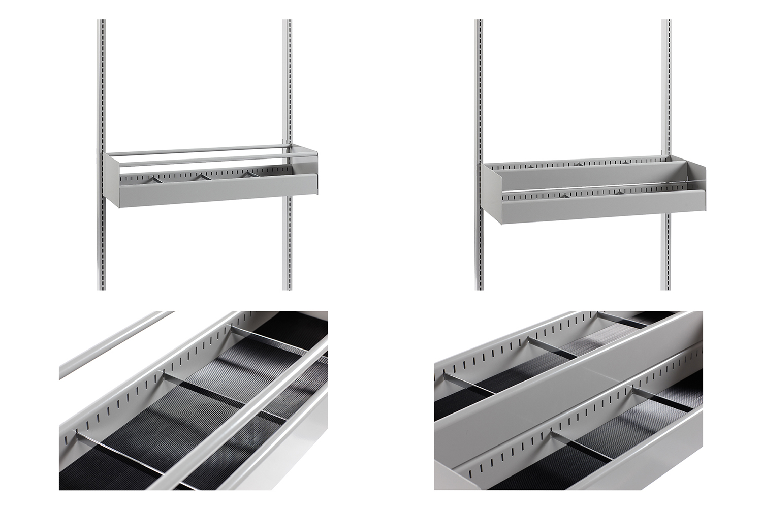 Dette kan gøres med forskellige typer hylder eller tilhørende elementer med forskellige funktioner, som derved skaber et helt unikt reolsystem.