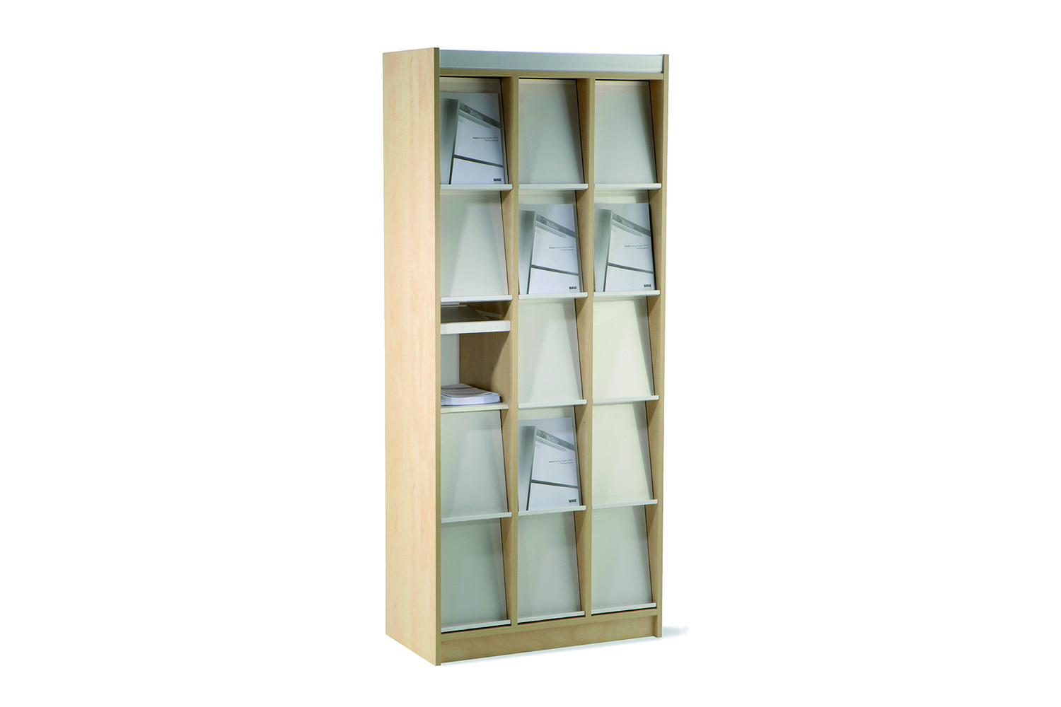 Unifach magasin displayreolen er ideel til at præsentere nye udgaver og opbevare ældre i selvsamme møbel. De hvide, plastik, skråhylder har et foliedække, hvori man kan sætte en kopi af det nyeste magasin og samtidigt sikre, at man nemt kan lægge magasinet tilbage på plads, når det er færdiglæst. Det er også muligt at sætte labels på hylderne.