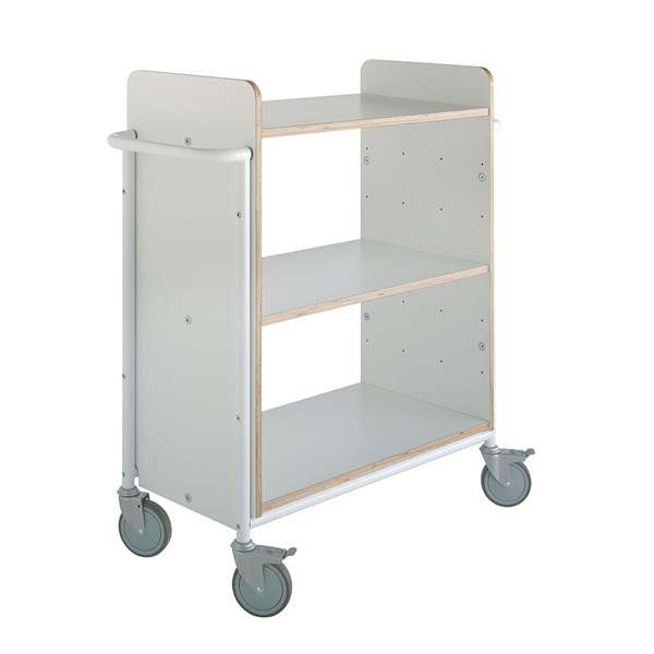 Dobbeltsidet bogvogn/transportvogn med stor volumen og 3 faste gennemgående hylder.