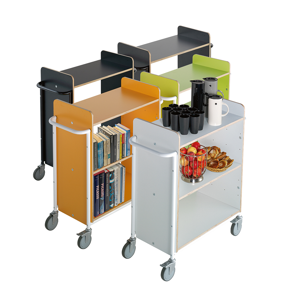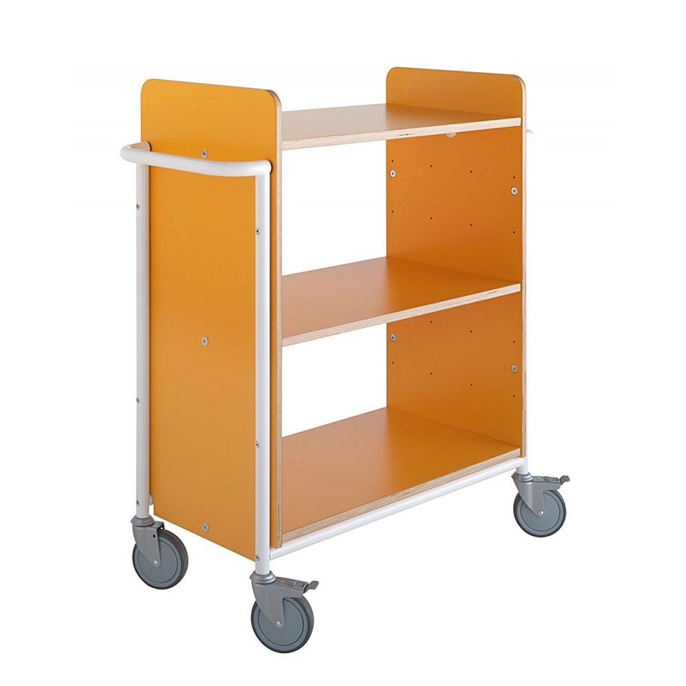 Dobbeltsidet bogvogn/transportvogn med stor volumen og 3 faste gennemgående hylder.