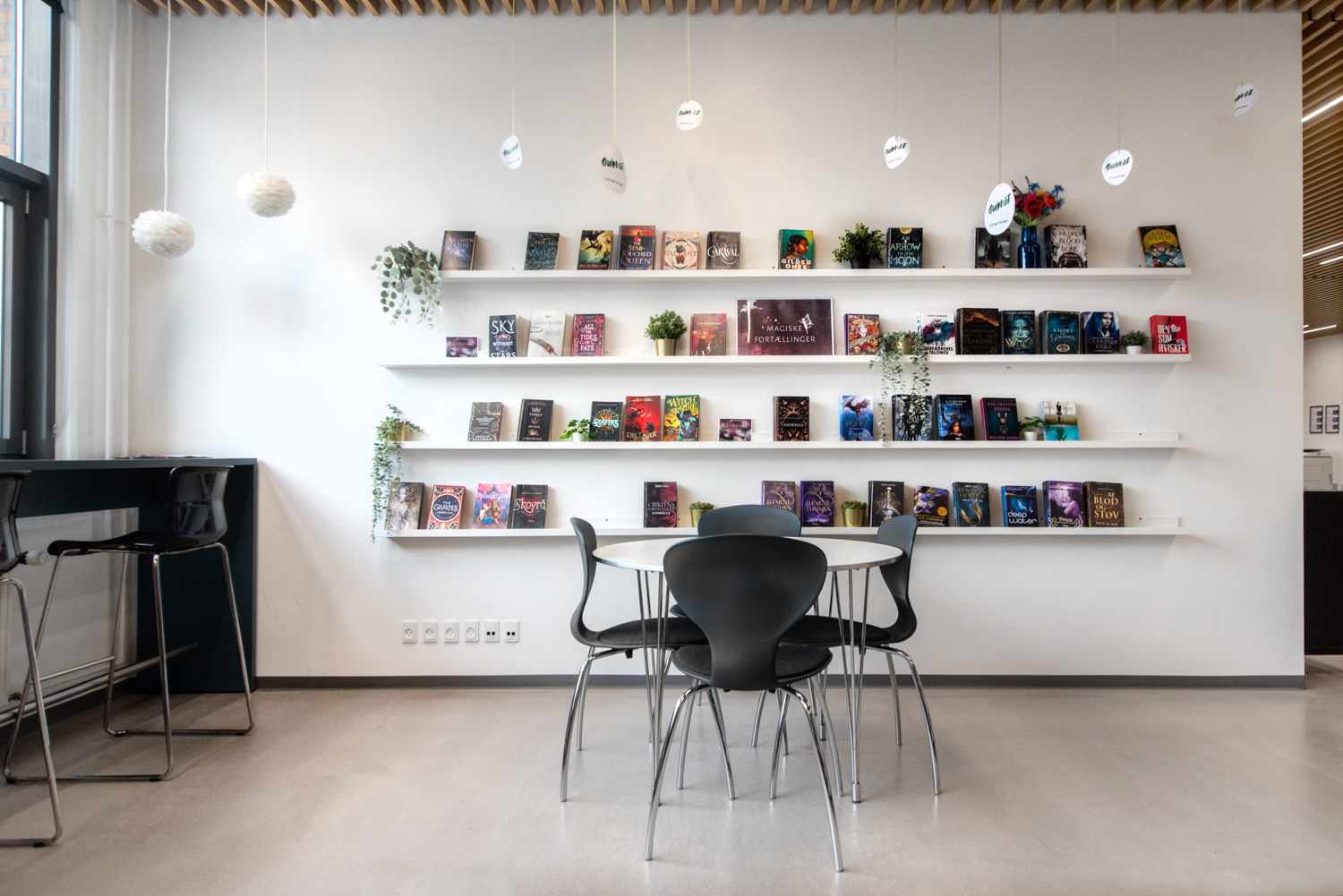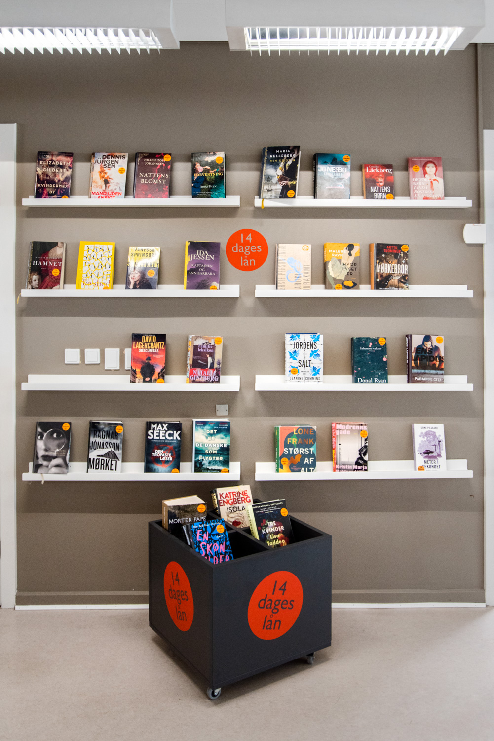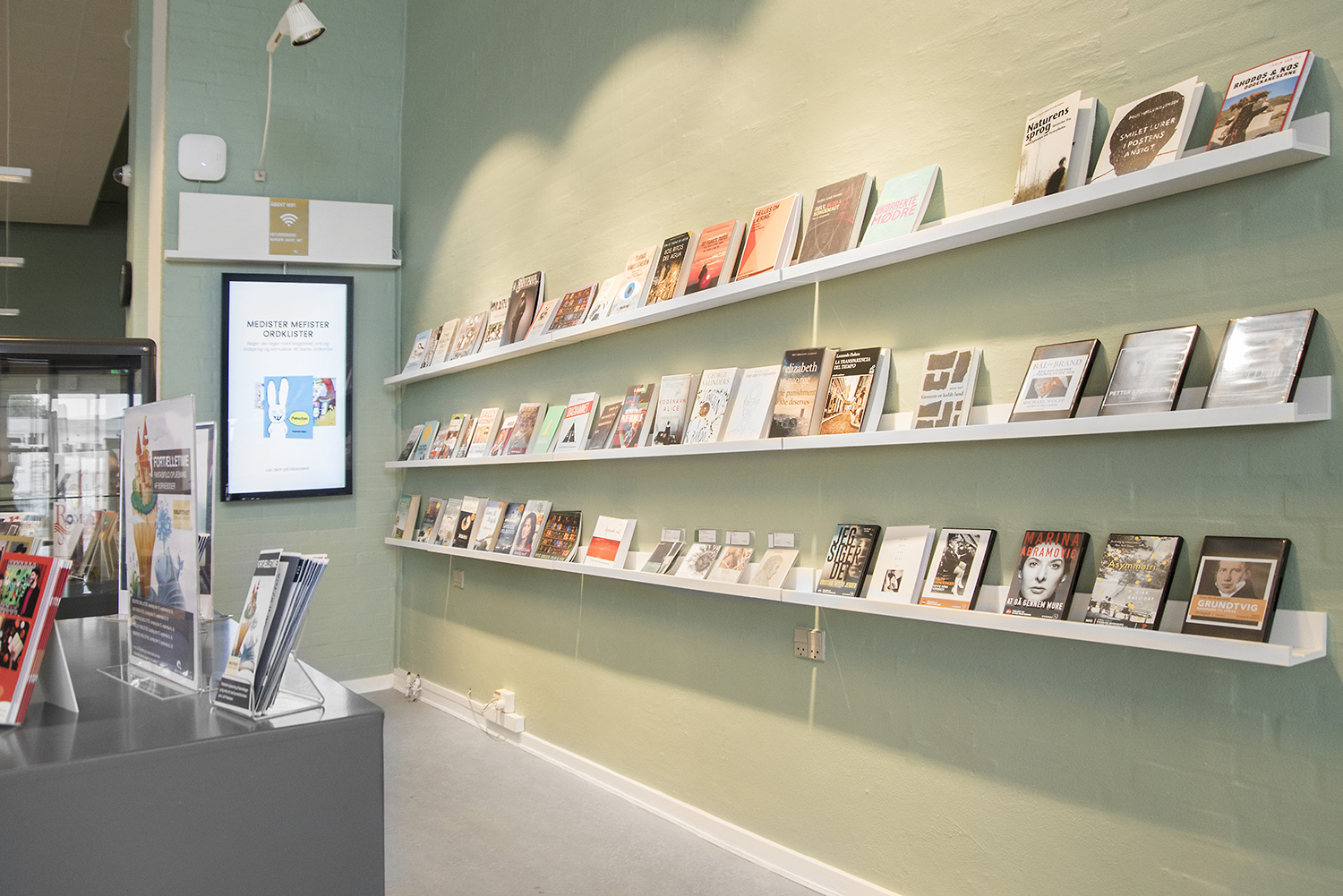 Udstillingshylde med frontkant. God til udstilling af forskellige medier.