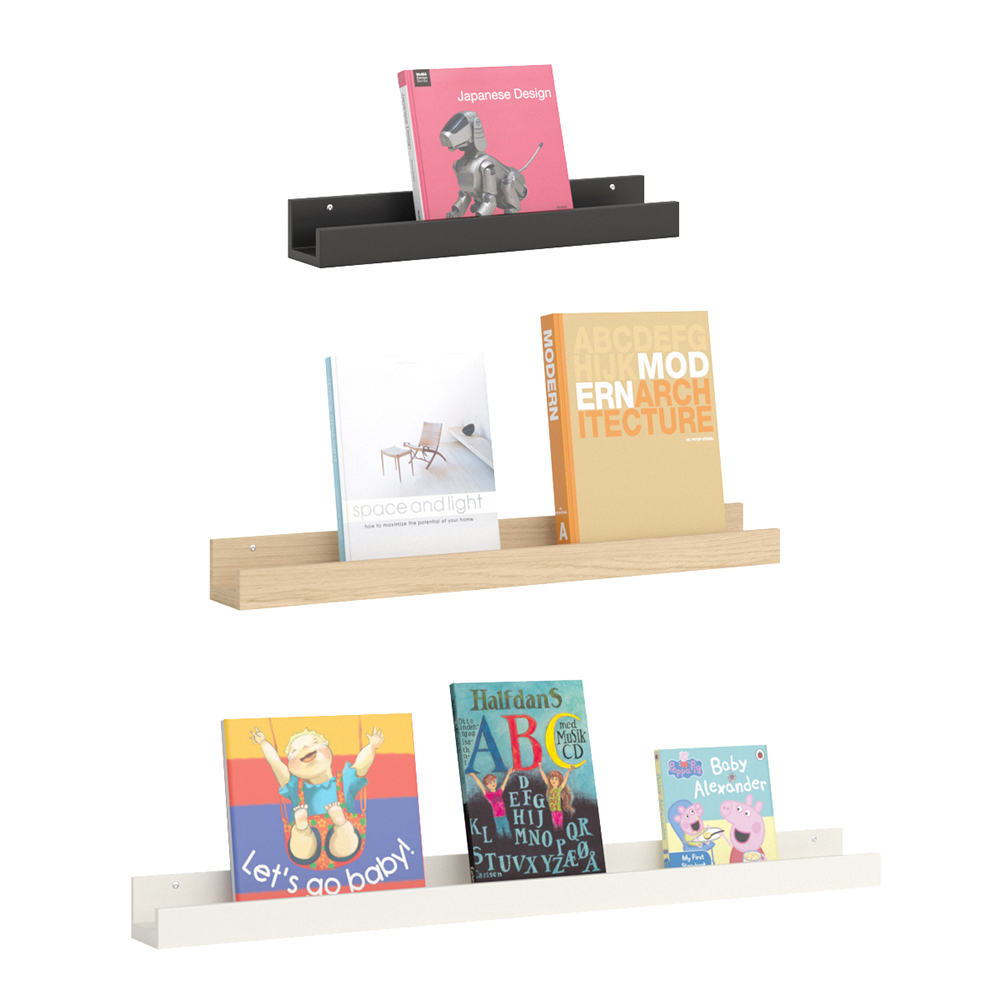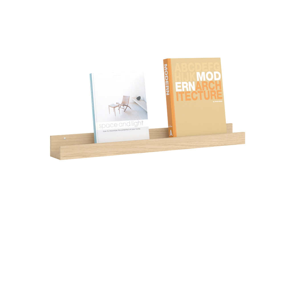 Udstillingshylde med frontkant. God til udstilling af forskellige medier.