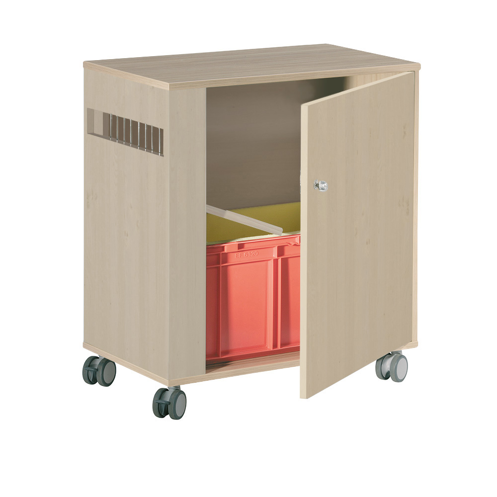 Skab med sideåbning og lås for nem adgang til afleverede bøger. Forsynet indvendigt med flytbar bogkasse med blød bund.