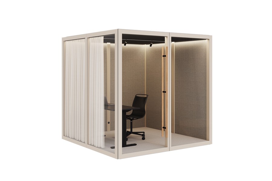 Zen Pod® kombinerer avanceret lydabsorberende teknologi med elegant design. To af væggene har akustikglas, mens de øvrige to vægge er lydabsorberende og beklædt med tekstil på inder- og ydersiden. Loftet er ligeledes lydisolerende med et behageligt lys.